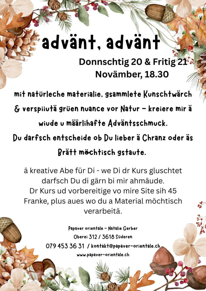 Ig bi d Natalie, di zwo kreative Häng hingerem Papaver orientale. Mitere grosse Liideschaft zur Natur u dr Floristik, viune gsammlete inspiratione u hie & da i Gedanke u Überlegige versunkä für ds nächstä Wärch wo einzigartig u mit viu liebi wird entstah.