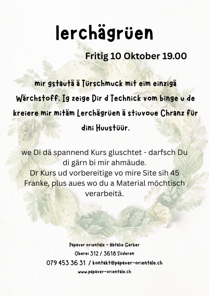 Dr charmant Bluemelade, wo d’Natur i ihrer schönschte Form gfiiret wird. Mir si stouz, Dir exklusivi Bluemekreatione und härzleche Service ds’bietä wo’s eso nur ufem Land müglech isch. Ihmitte vo saftige Hügle u Fäuder erwartet Di ä Oase vor Rueh u Authenzität. Aus liideschaftlichi Florischtin legä ig höchschtä Wärt uf d’Uswau vo de Blueme u Pflanze. Jedä Struss, jedi usgschmückti Pflanzä u jedes Arrangschma isch es handgfertigts Meischterwärch. Üse chli Lade strauht ä ruschtikale Charme vo Landläbe us. D’Irichtig isch verschnörkelet u gmüethlech, d’Atmosphäre isch prägt vo Härzlechkeit. Bi üs gits ke Masseverchouf, sondern ä persönlechi Beratig, wo Diner Wünsch u Vorstellige im Mittupunkt stöh. Papaver Orientale isch meh aus nume ä Bluemelade – es isch ä Ort, wo d’Schönheit vor Natur i vouer Pracht blüiht. Mir lade di härzlech i, chumm verbi und la di vo natürleche Bluemekreatione la inspiriere. Ob für ne bsundere Ahlass oder eifach für Dir säuber ä Fröid ds’mache – bi üs fingsch ds perfekte Bluemeerläbnis ufem Land.