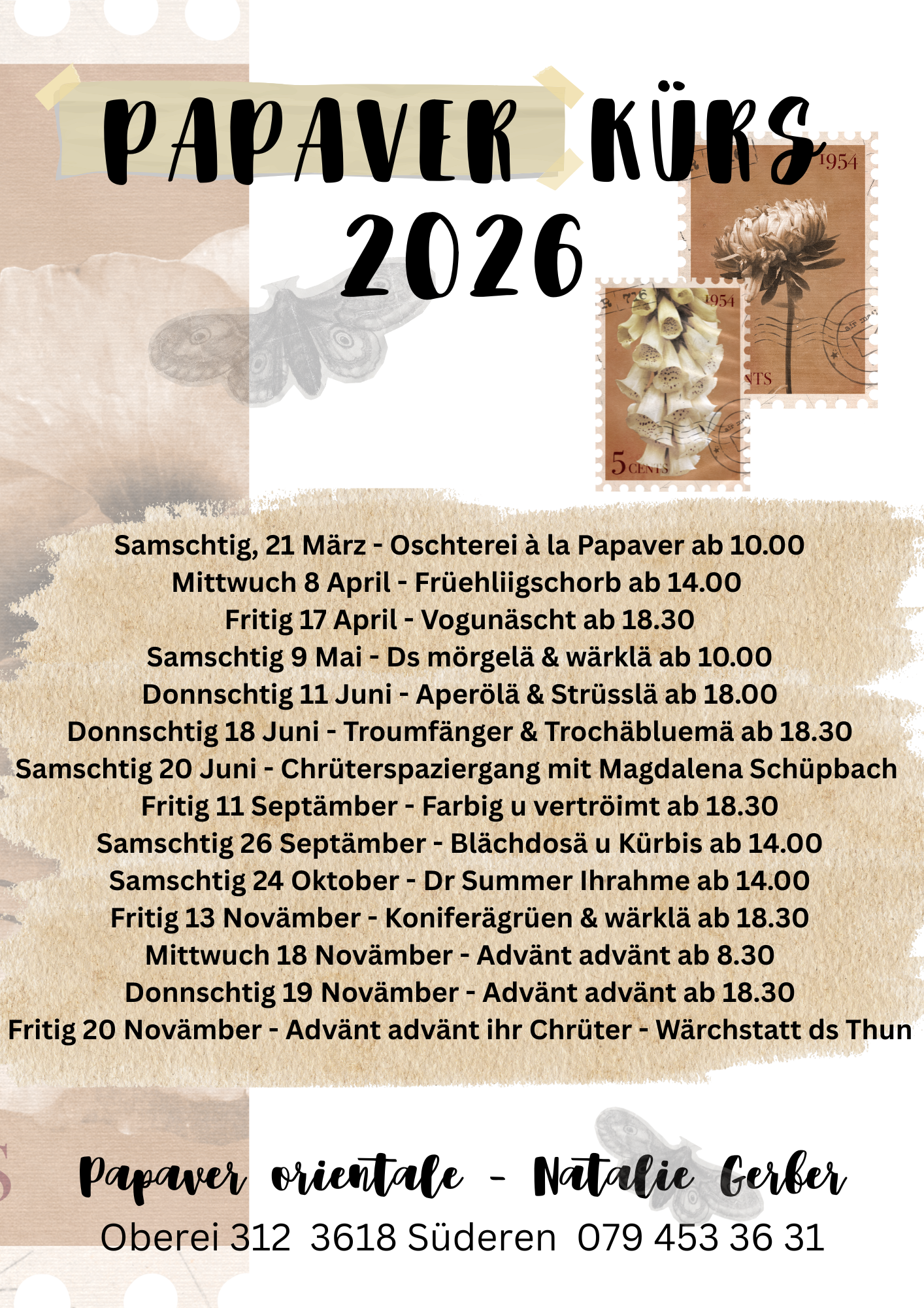 dr papaver duet d türe vom bluemelade mit de klassische öffnigszyte schliesse. mir wärde zuekünftig für ahläss, kürs, härzenswünsch, märite u erschaffendi tate für di da si. wild u naturverliebt, flexibu u nid beständig – d fröid u ds härz si im vordergrund.