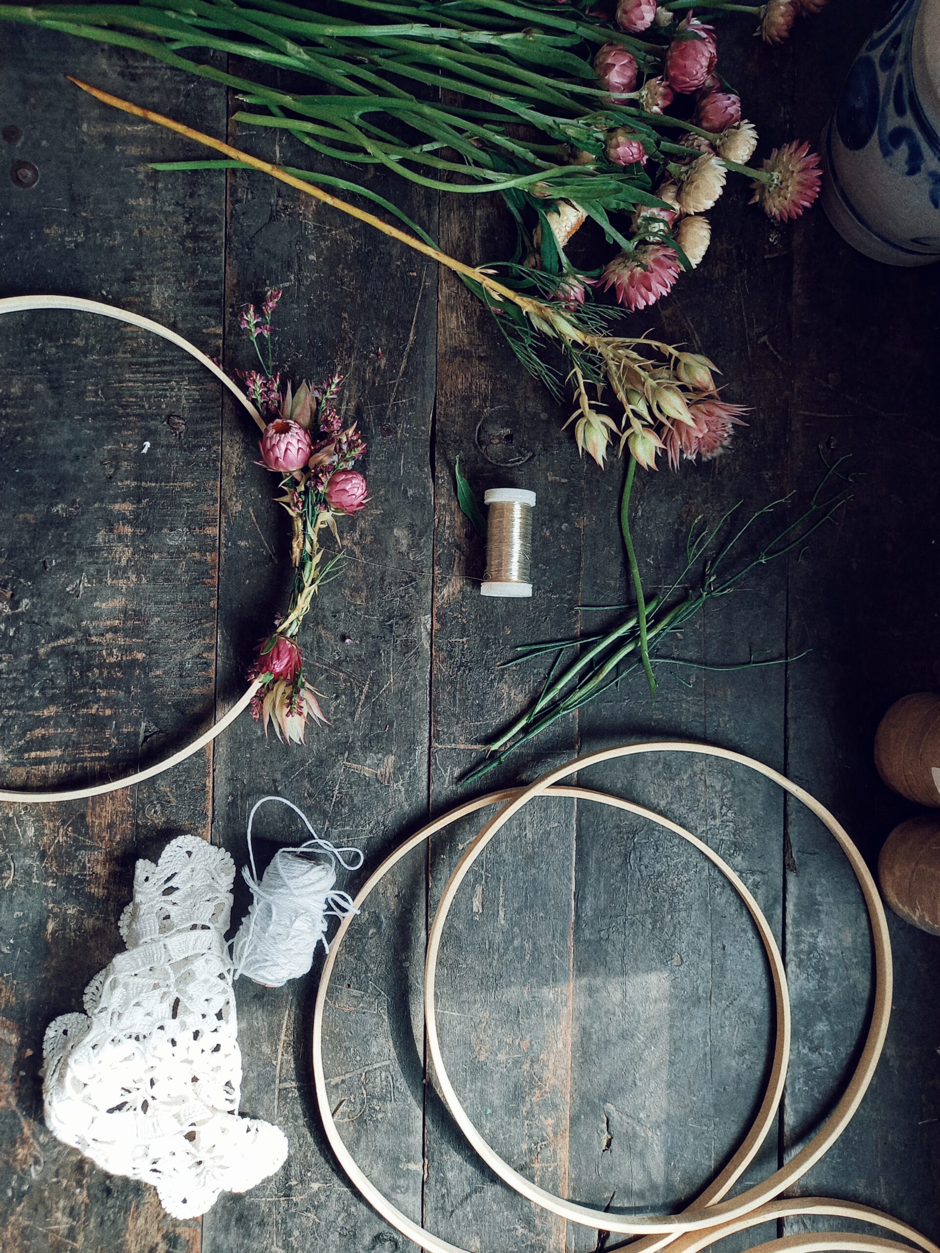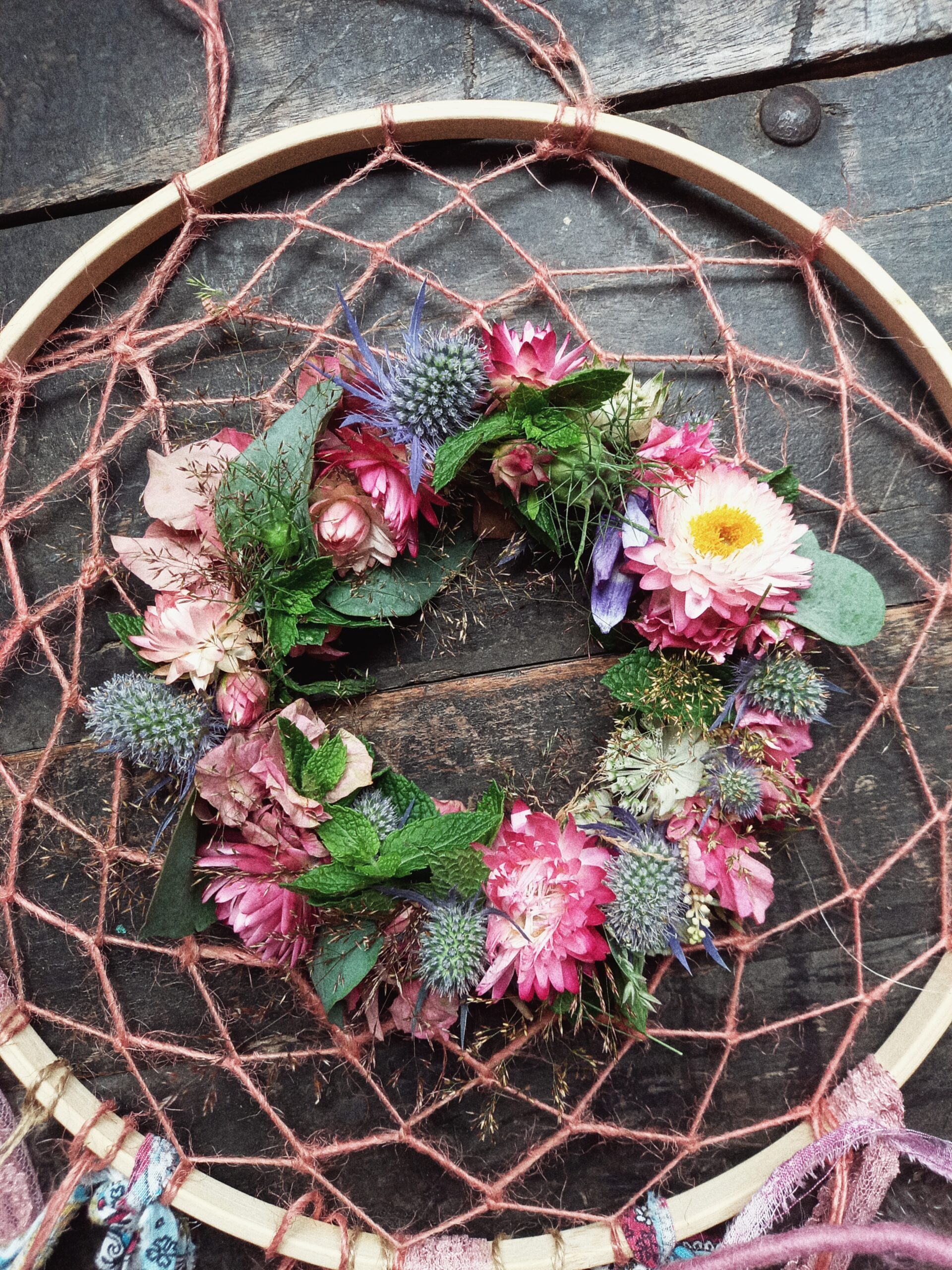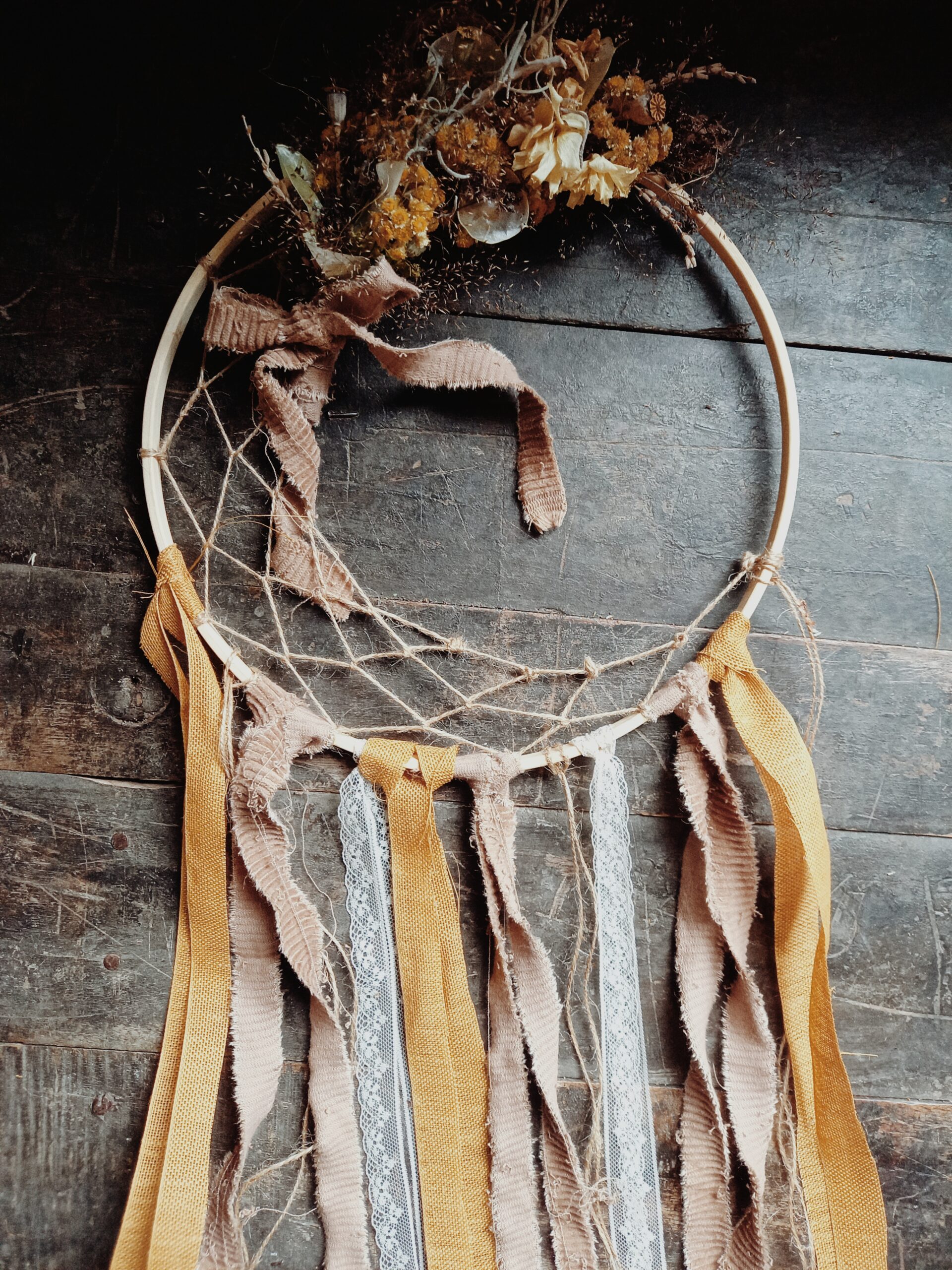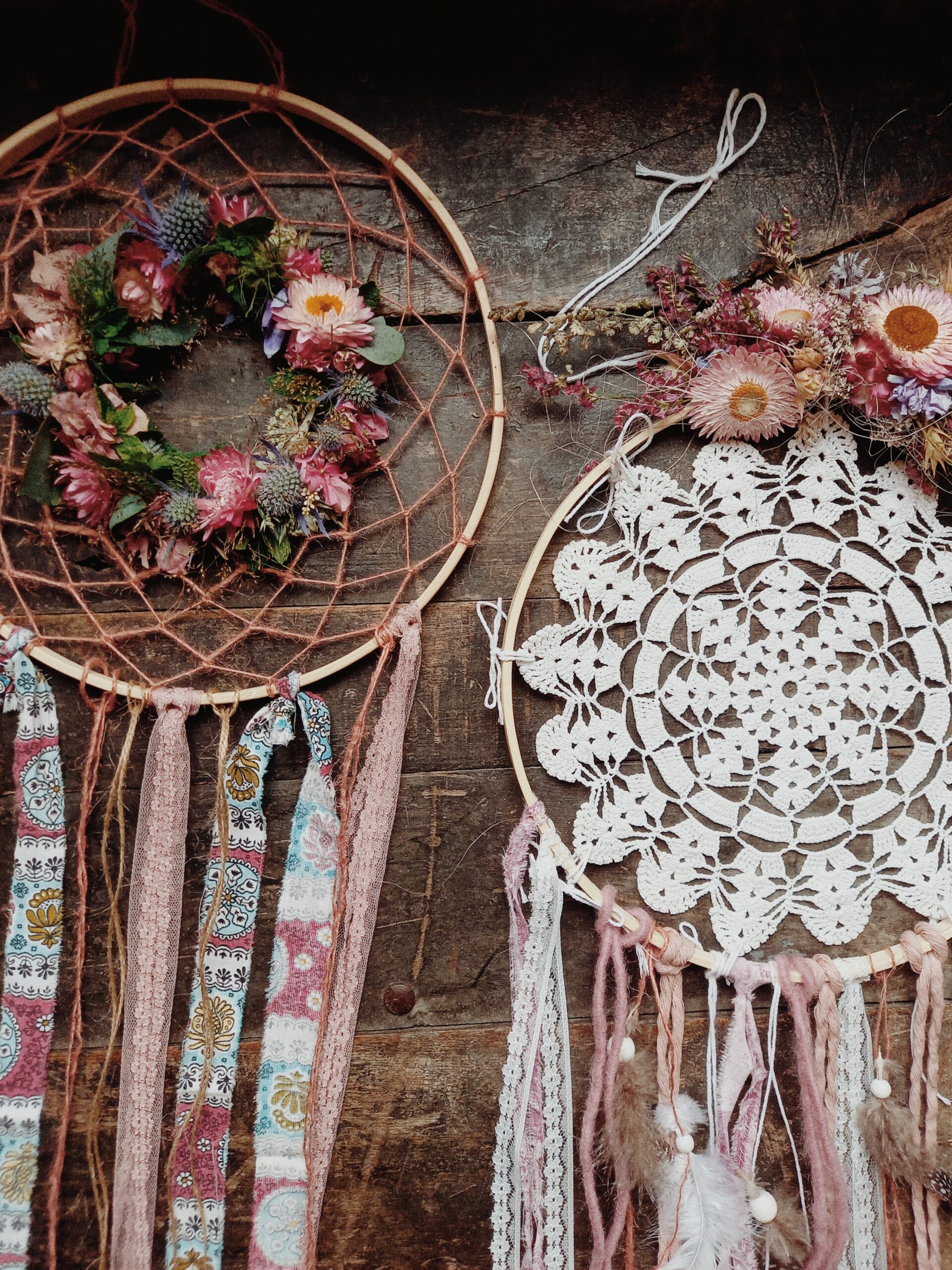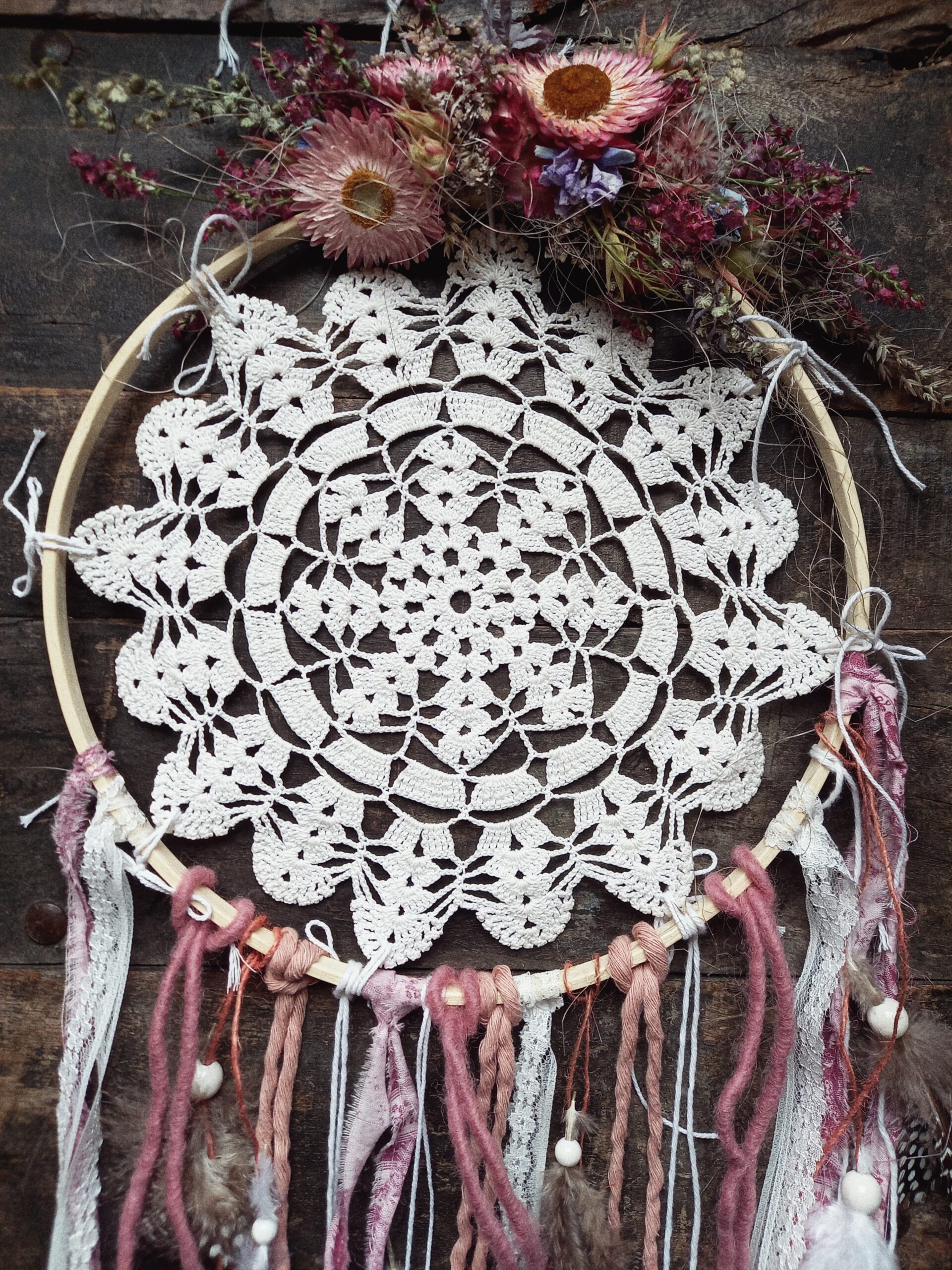 Mir gstaute di einzigartig troumfänger. Mit perlä, chuglä, fäderli u tröchnete bluemä. Gärn darfsch du diner eigete accessoires mitbringe zum integrierä.